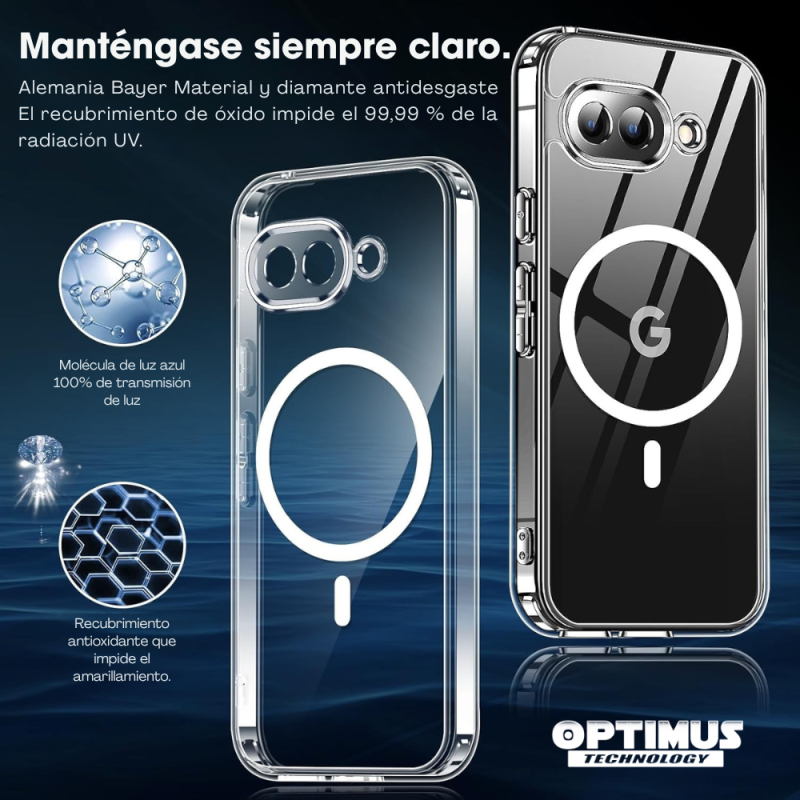 El nuevo estuche de goma transparente con MagSafe de OPTIMUS™, diseñado especialmente para el Google Pixel 9a, ofrece máxima protección contra golpes, caídas y rayones, manteniendo el diseño original de tu dispositivo y permitiendo la carga inalámbrica rápida gracias a su compatibilidad con MagSafe.