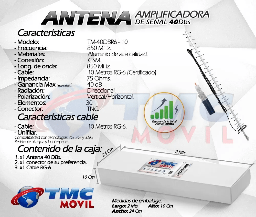 La antena TasKer™ direccional funciona con frecuencias de 700-850-1990 MHz. Por lo que es adecuado para su uso con aplicaciones GSM. Esta es la antena de mayor ganancia ideal para Flujo de llamadas y envio de datos de equipos M2M, Telimetria, fabricada por TMC Movil®. Esta antena unidireccional también tiene polarización a la intemperie.