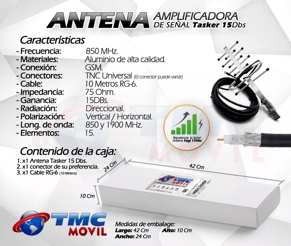 La nueva antena TasKer-15™ 15dB es una antena amplificadora de señal para todos los dispositivos que tengan problemas de señal recepción de llamadas en su casa o apartamento en zonas dentro del casco urbano.