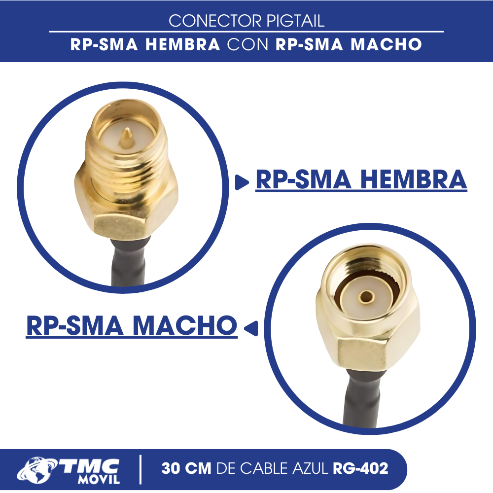 Este cable conector pigtail de 30 cm con cable color azul RG-402, cuenta con un conector RP-SMA macho y un conector RP-SMA hembra.