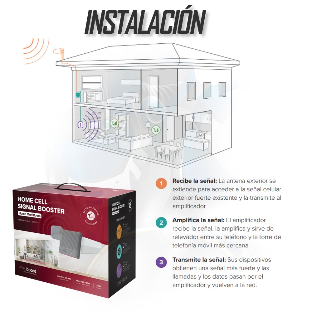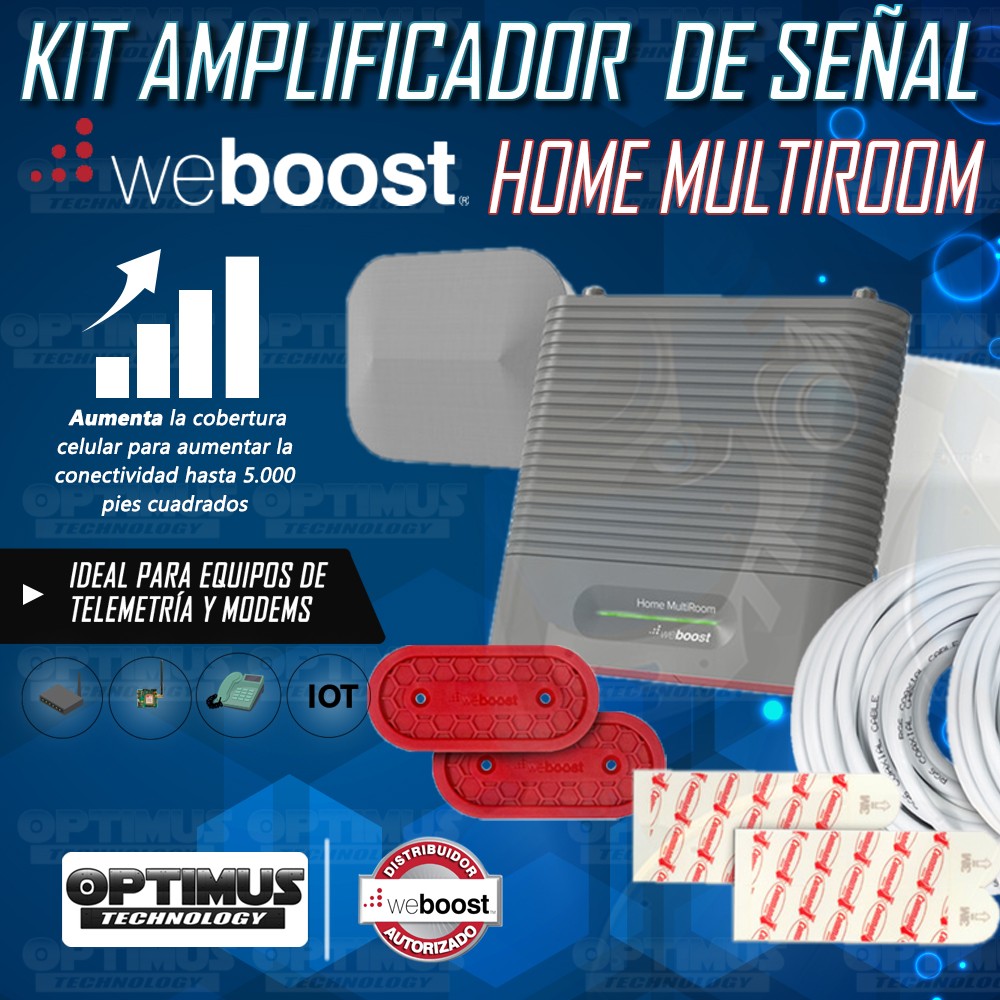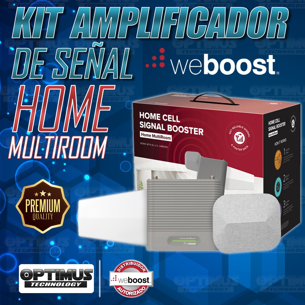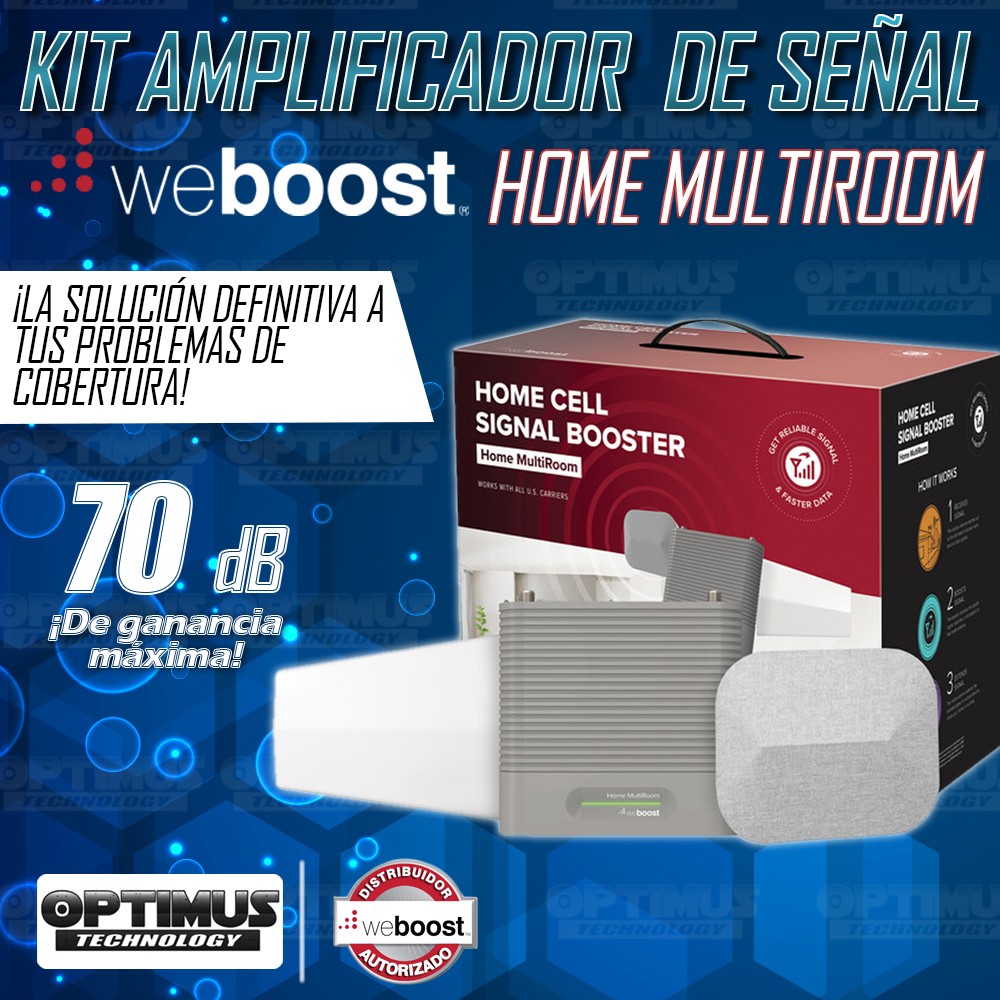 WeBoost Home MultiRoom es un amplificador de señal de teléfono celular doméstico para múltiples usuarios. Con una ganancia máxima de 70 dB, está clasificada para aumentar la conectividad celular para hasta tres salas grandes (o hasta 5,000 pies cuadrados)