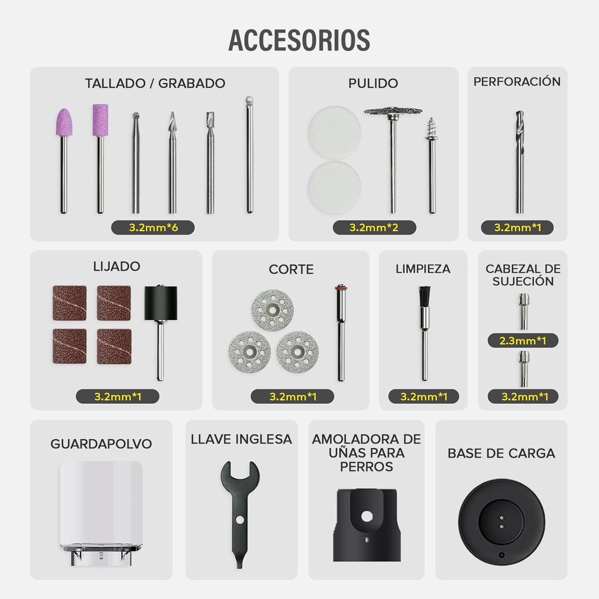Uso: Multiuso – Lijar, Pulir, Taladrar, Tallar, Cortar