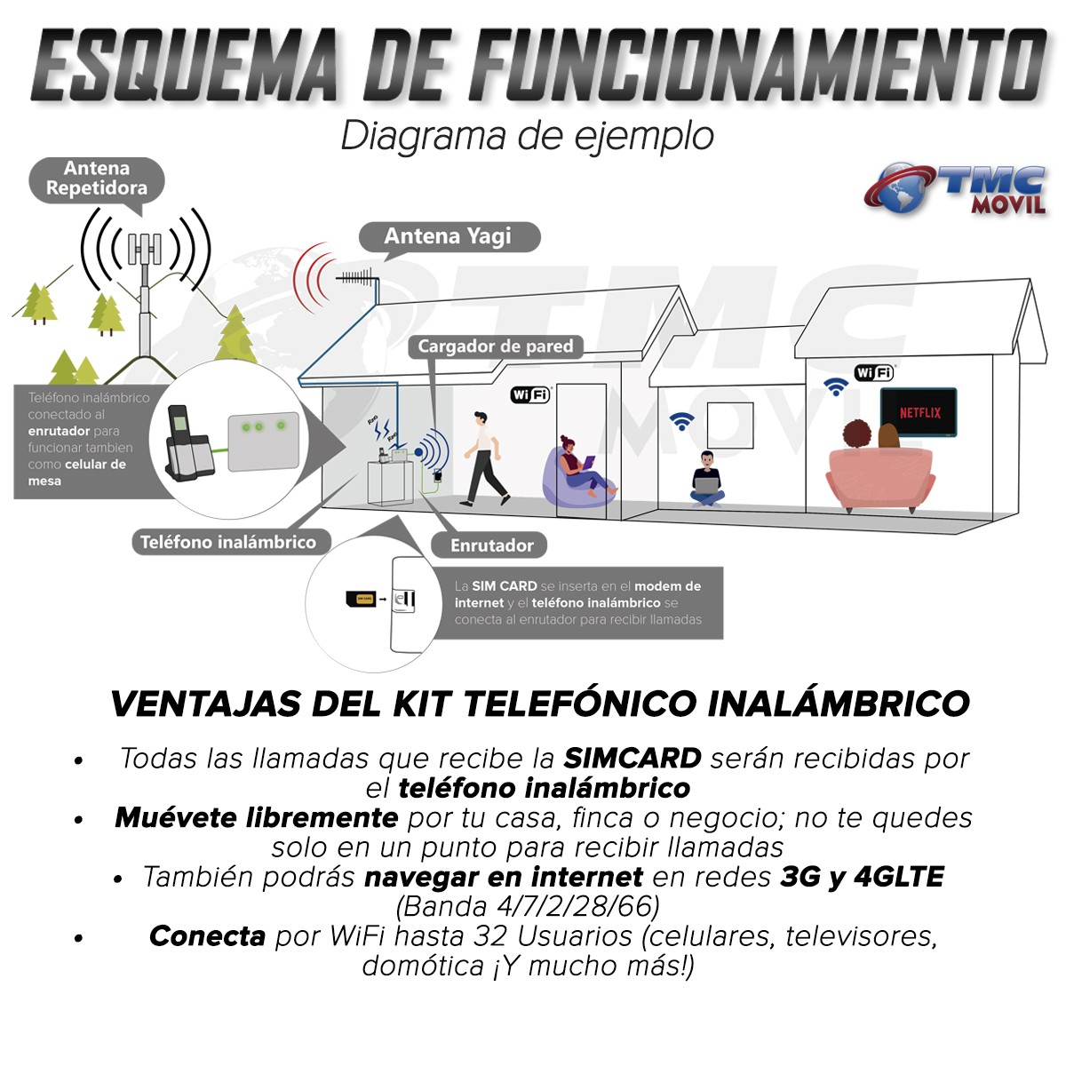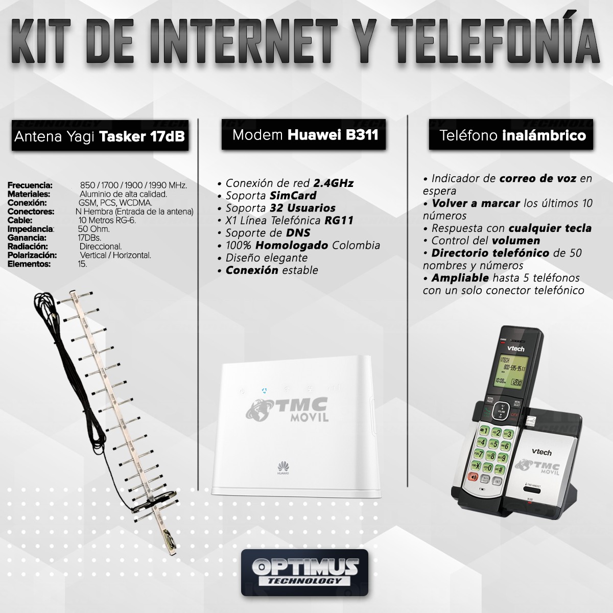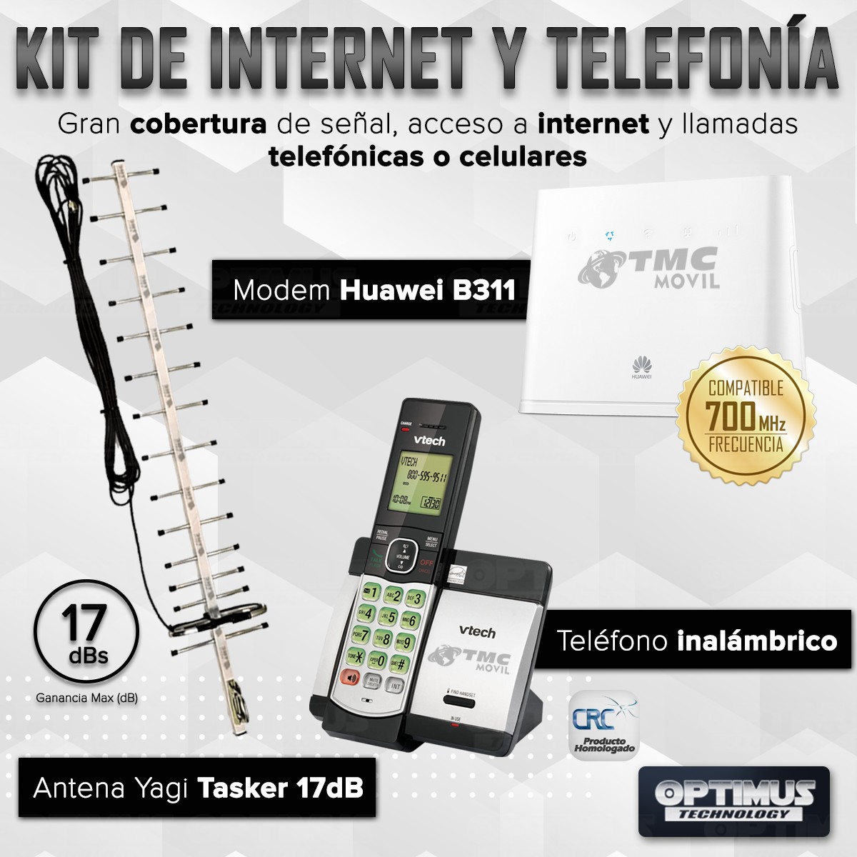 KIT Rural Teléfono Inalámbrico de mesa + Modem De Internet Huawei B311 Sim card 4GLTE + Antena Amplificadora De Señal Yagi 17 Db
