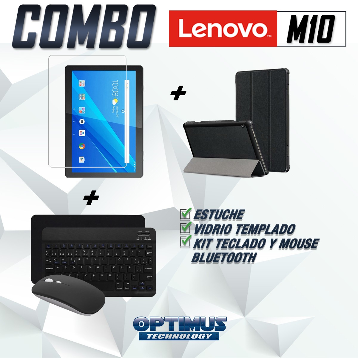 Los ¡Nuevos Kits de Estuche + Vidrio + Teclado + Mouse Bluetooth de OPTIMUS™ Le brindan a tu Tablet una alta protección y funcionalidad completa!