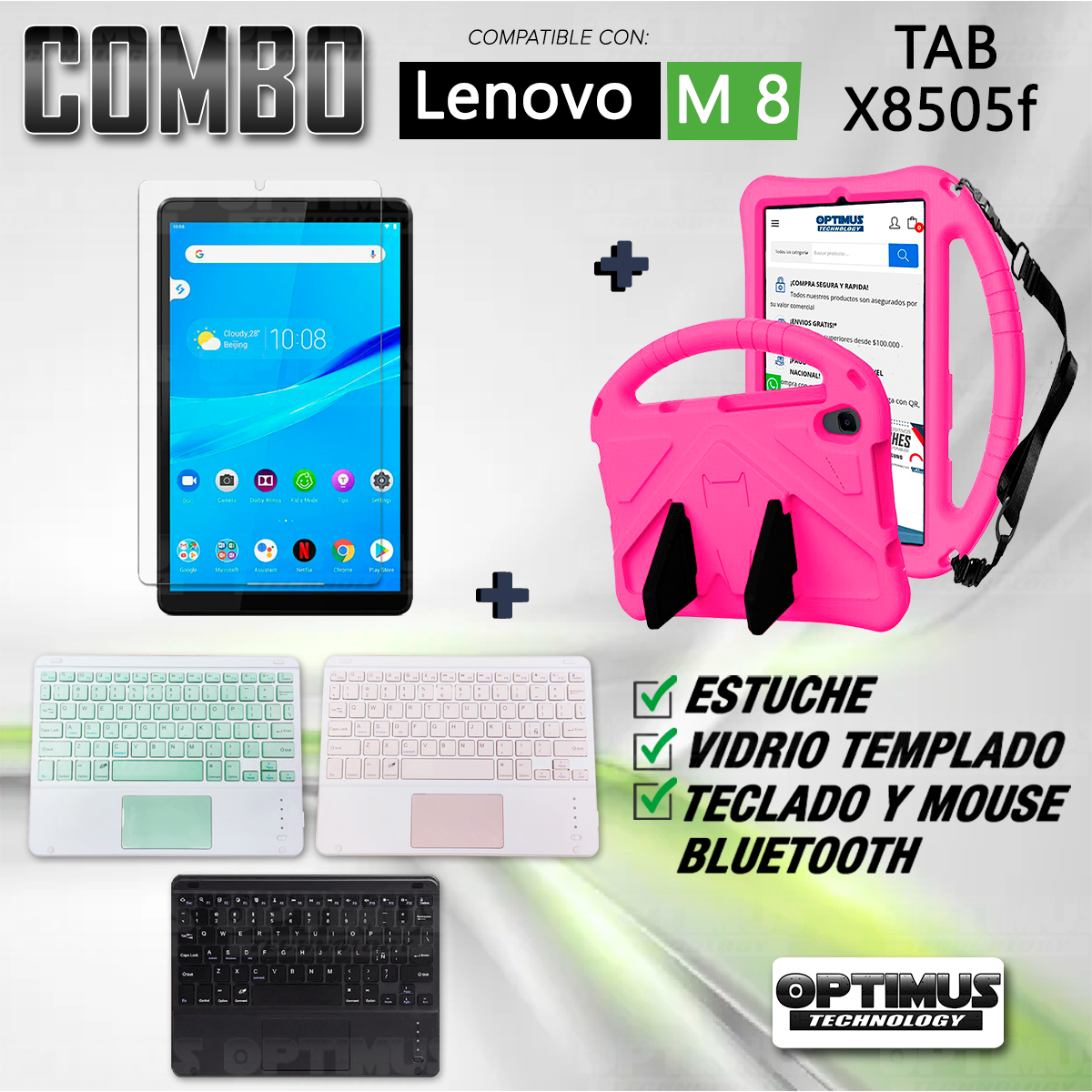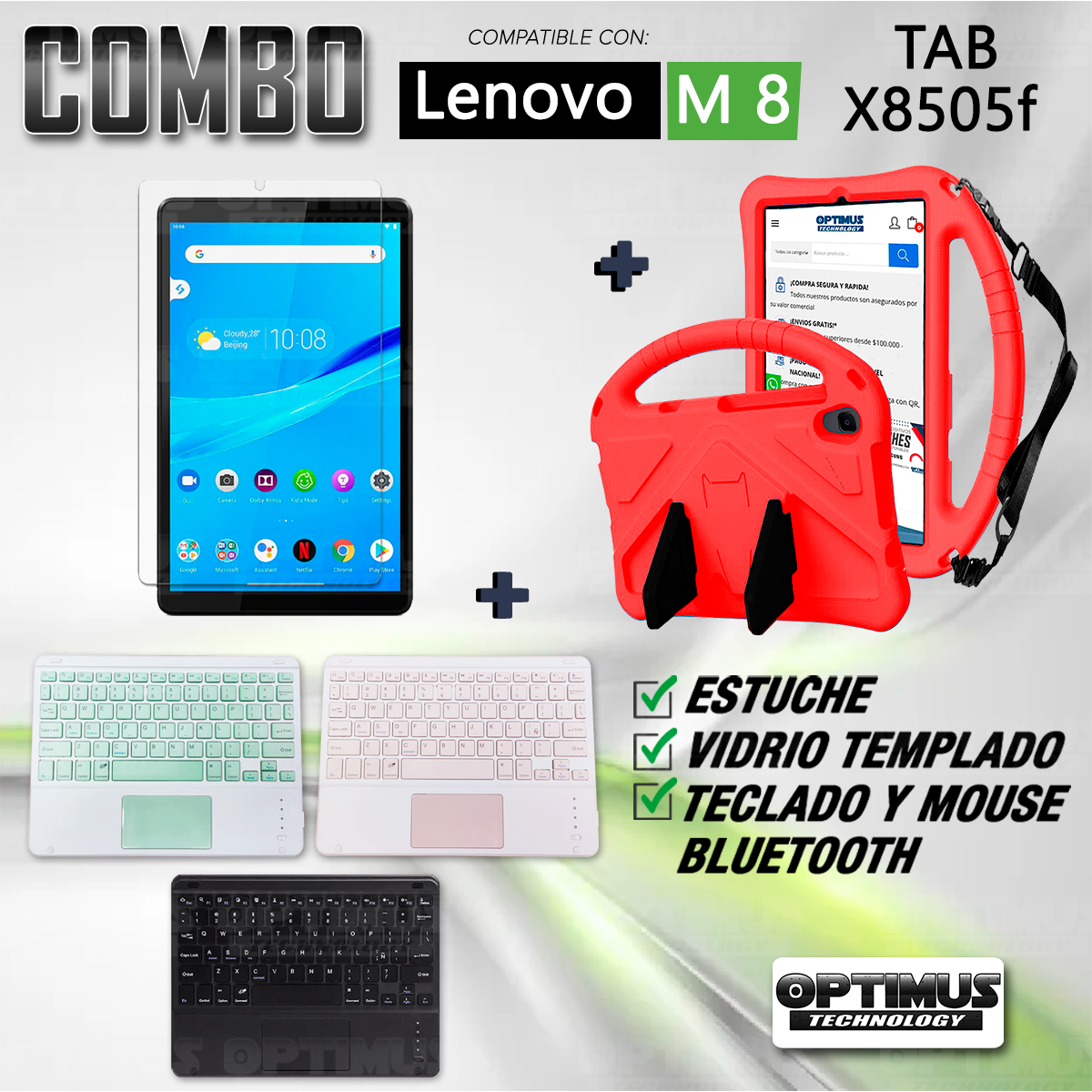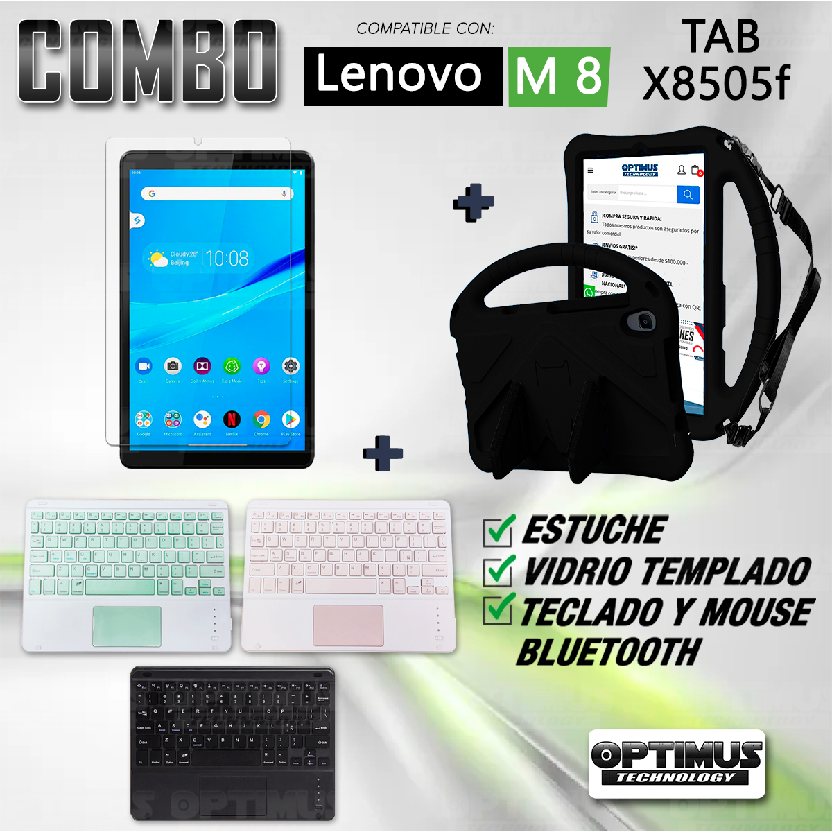 Los ¡Nuevos Kits de Estuche + Vidrio + Teclado + Mouse Touchpad Bluetooth de OPTIMUS™ Le brindan a tu Tablet una alta protección y funcionalidad completa!