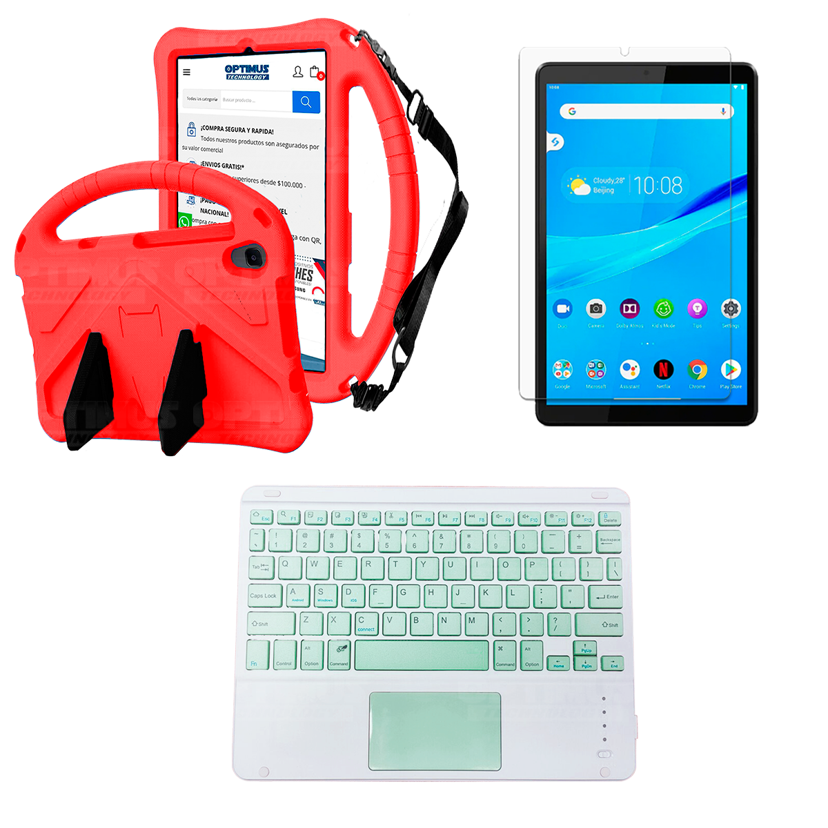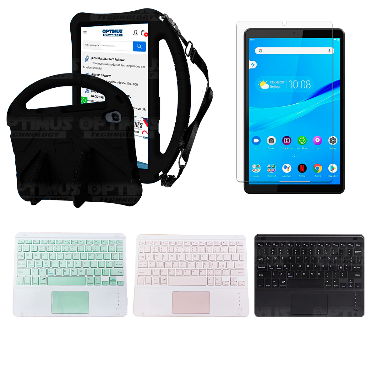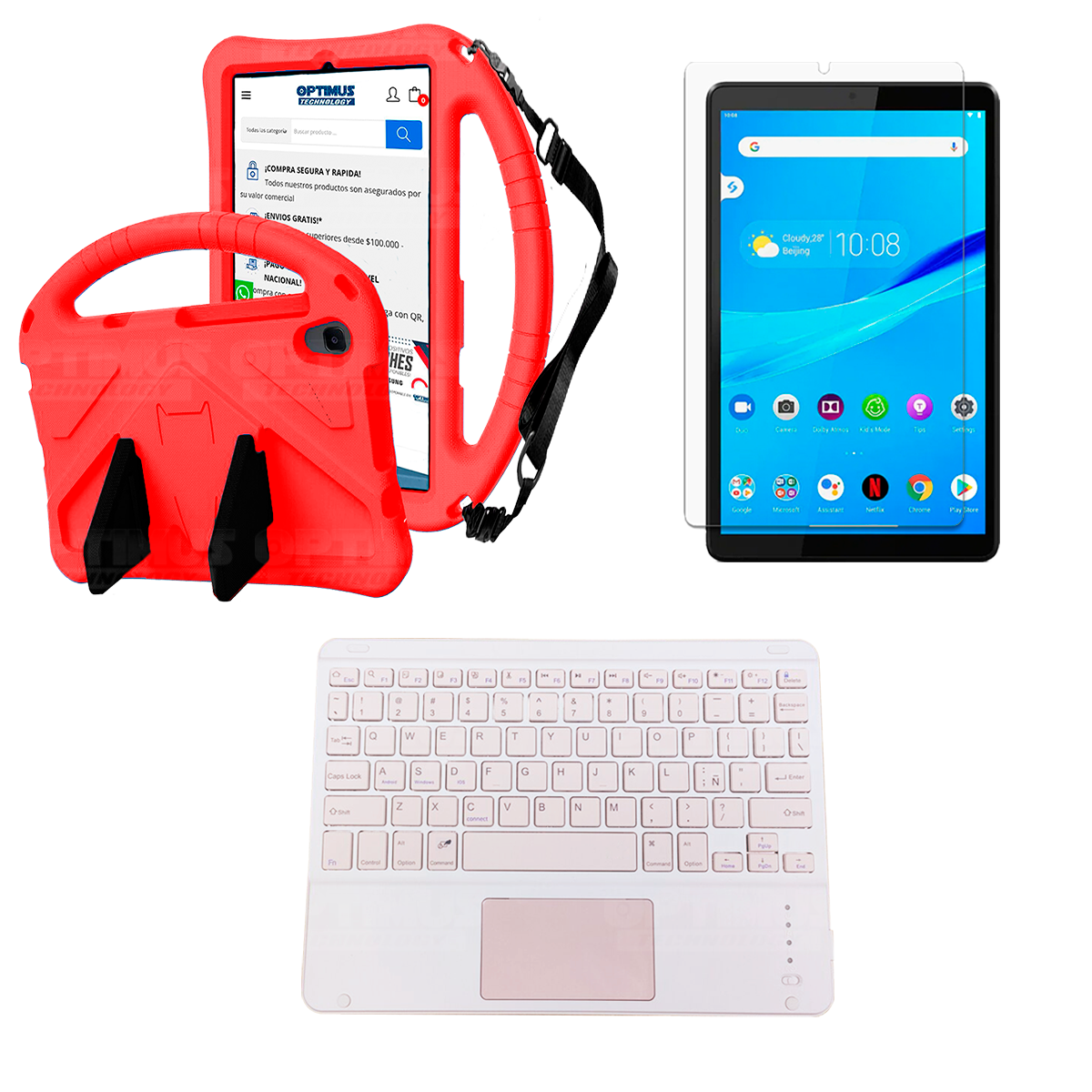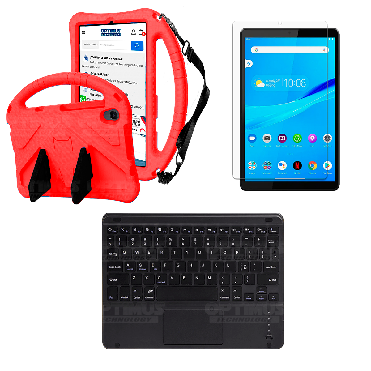 Los ¡Nuevos Kits de Estuche + Vidrio + Teclado + Mouse Touchpad Bluetooth de OPTIMUS™ Le brindan a tu Tablet una alta protección y funcionalidad completa!