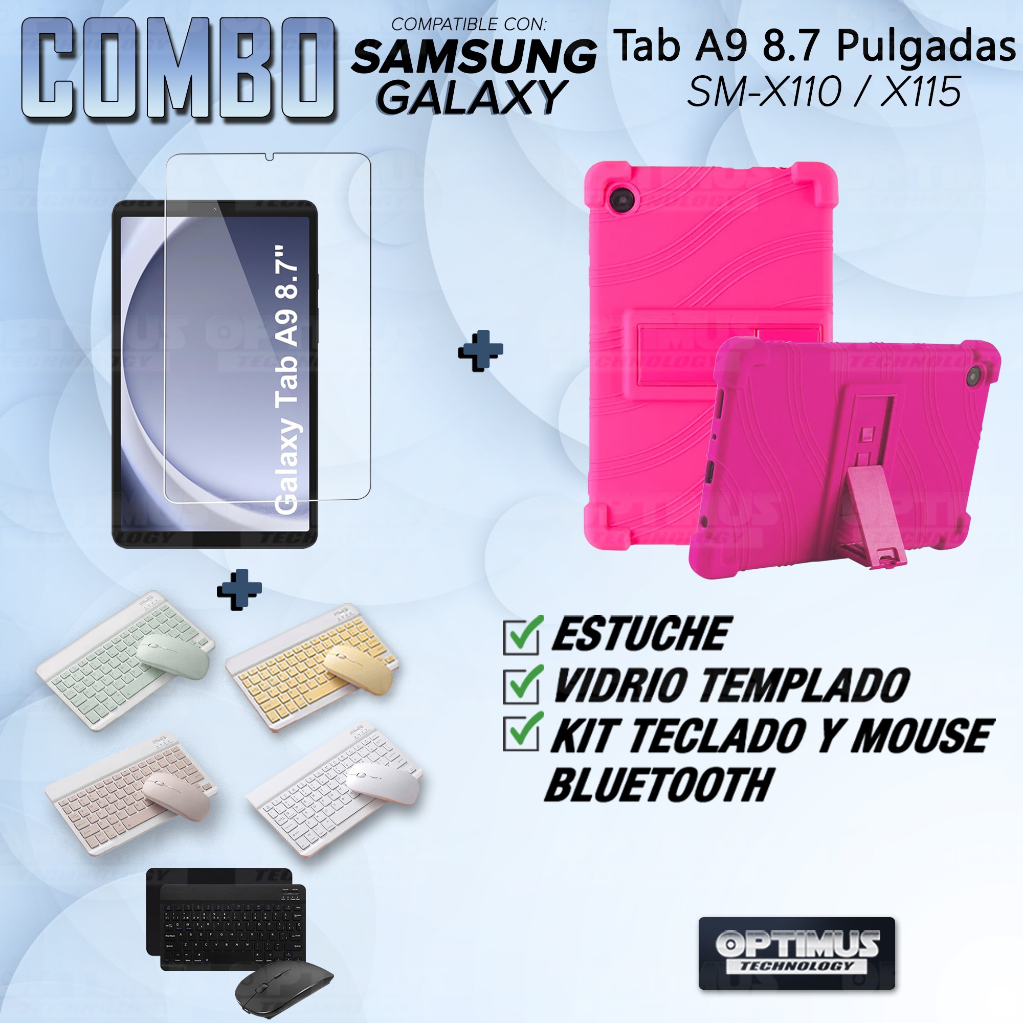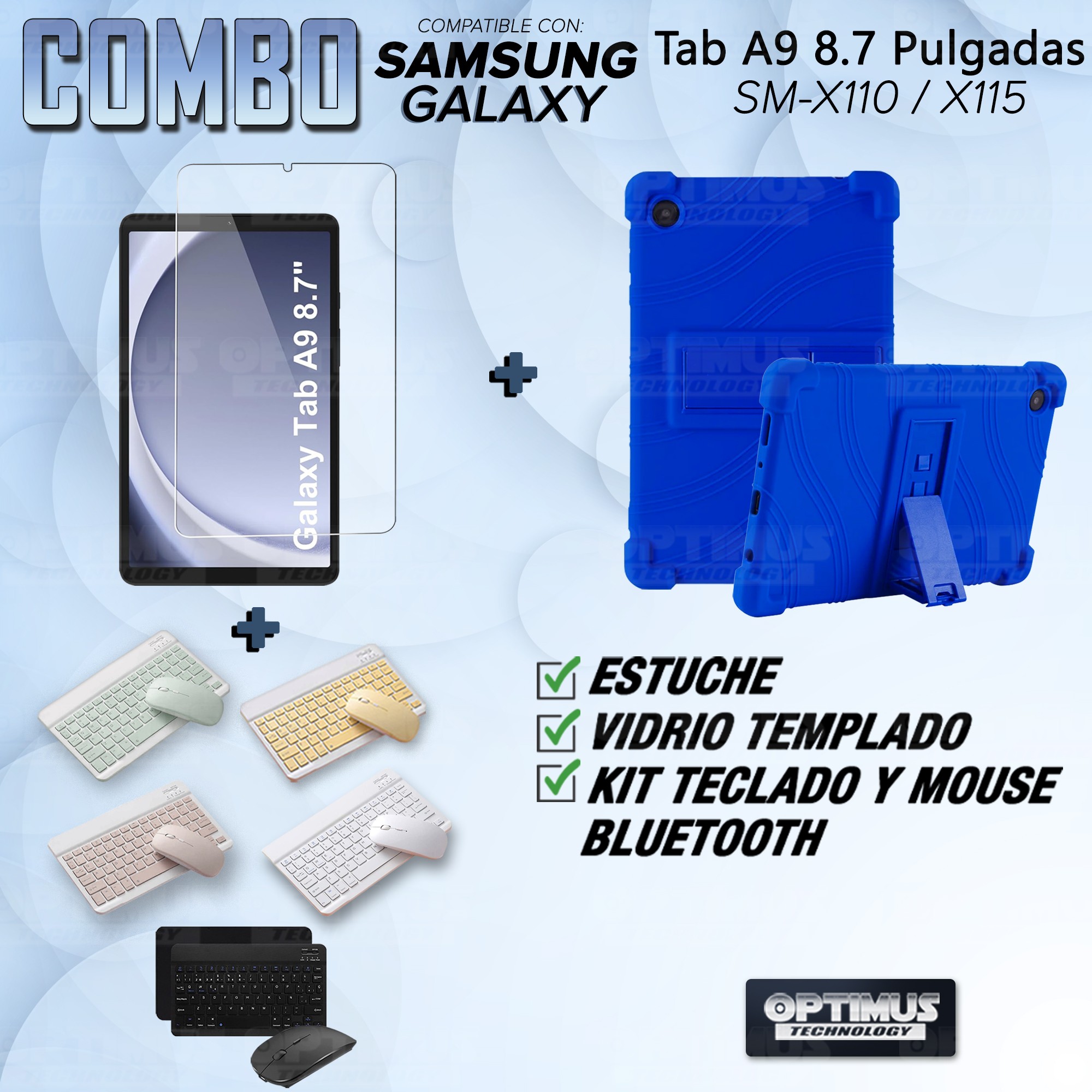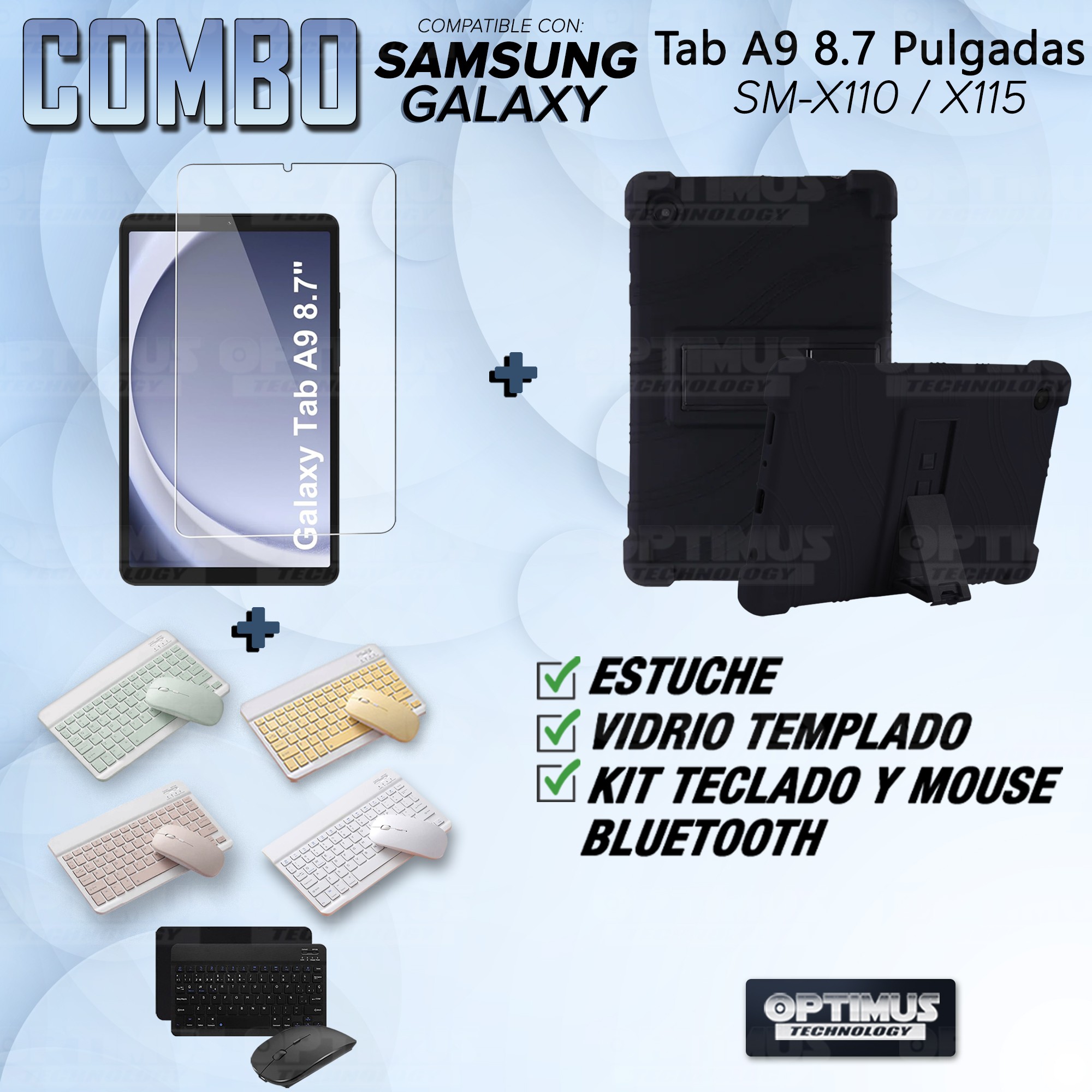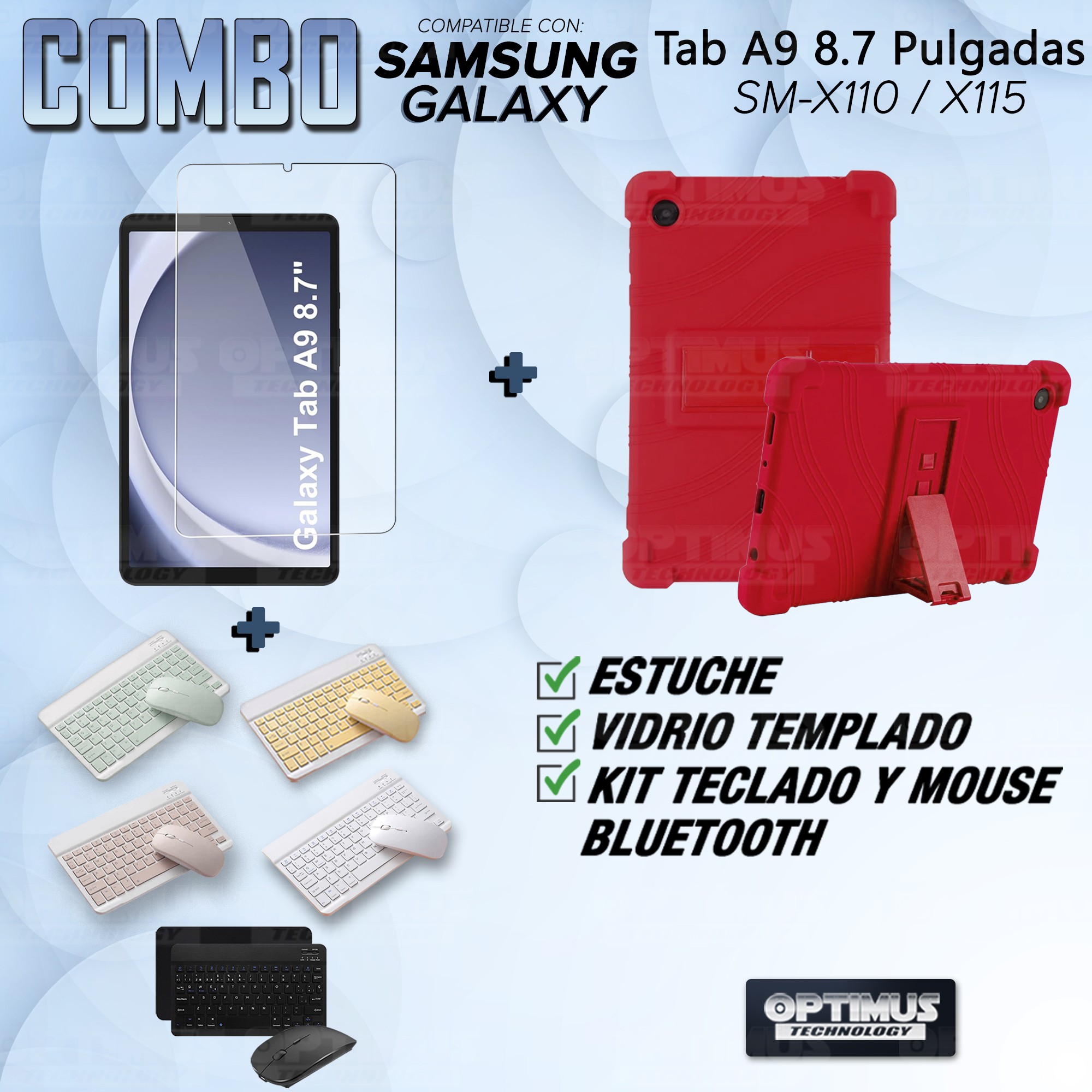 Los ¡Nuevos Kits de Estuche + Vidrio + Teclado + Mouse Bluetooth de OPTIMUS™ Le brindan a tu Tablet una alta protección y funcionalidad completa!