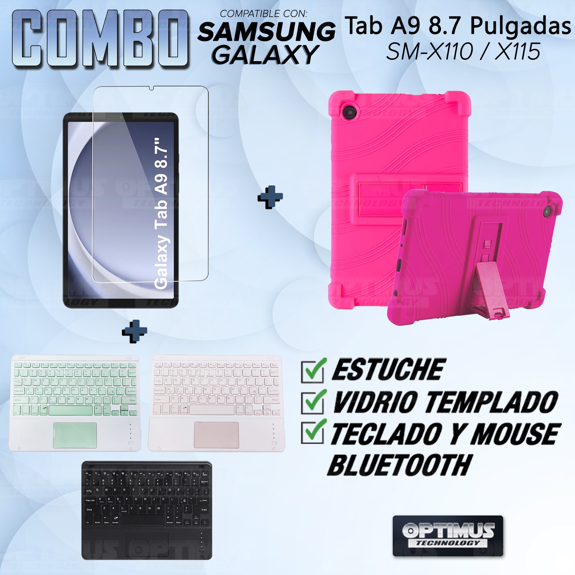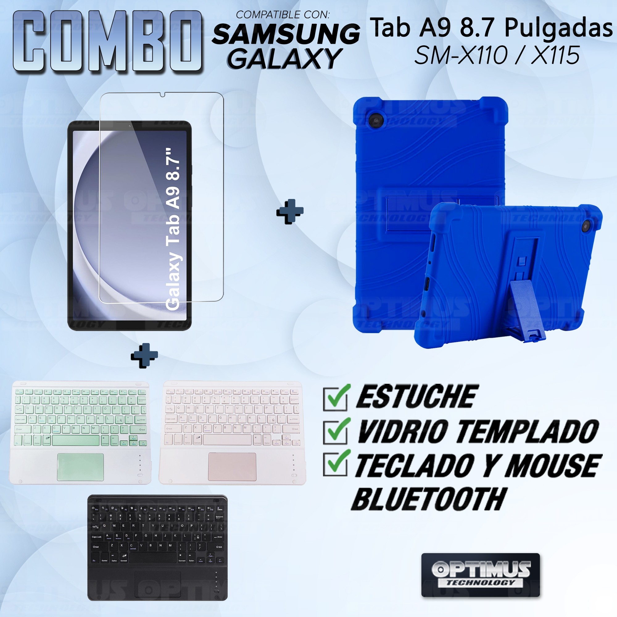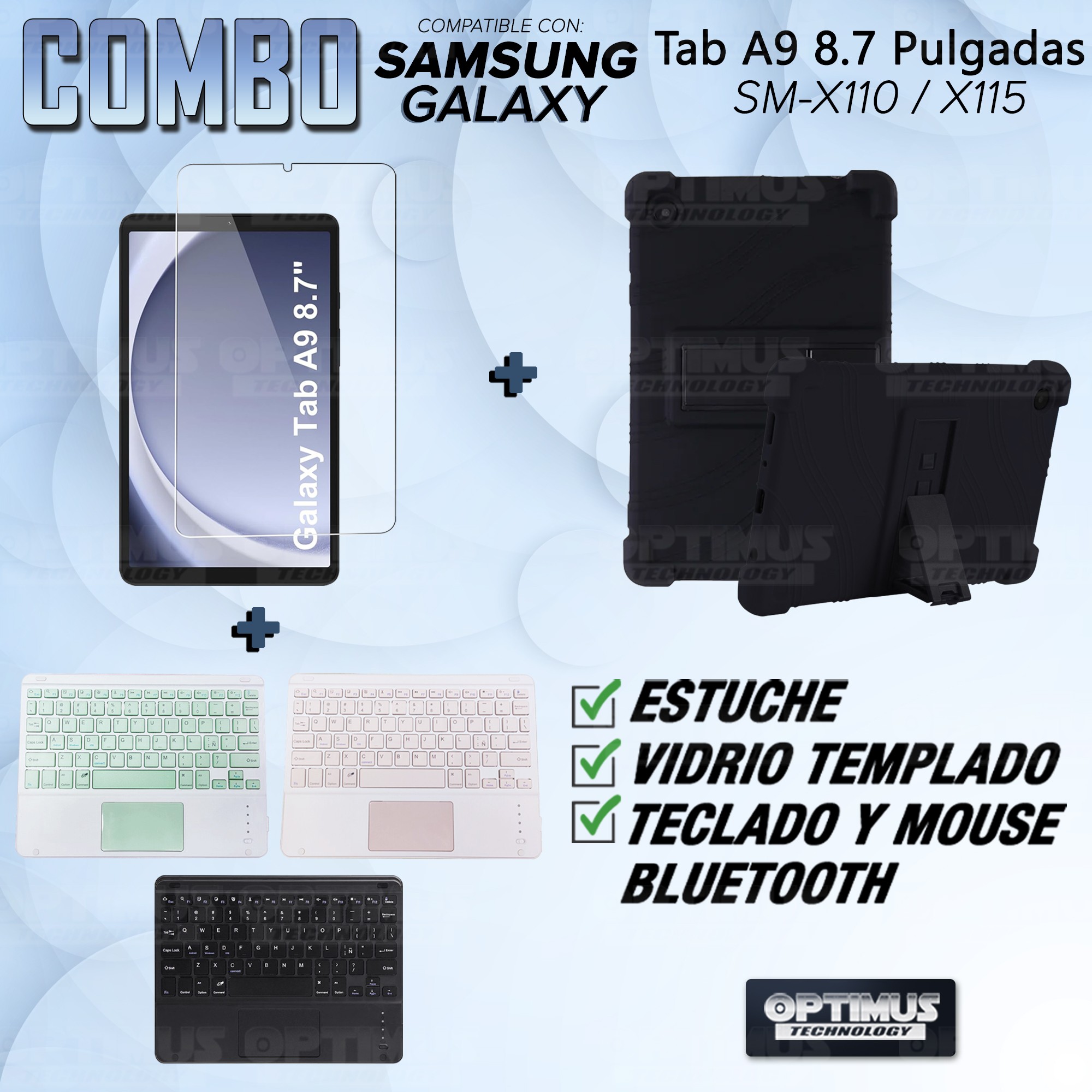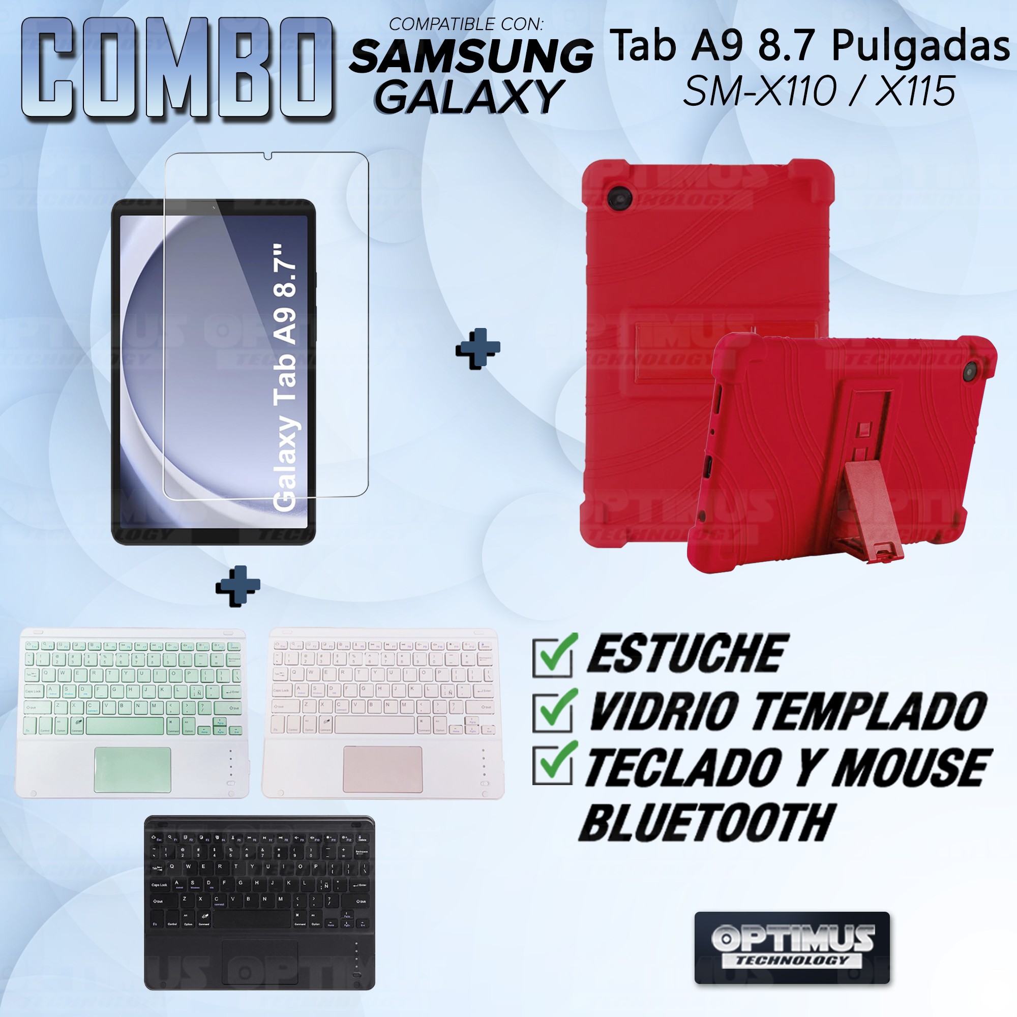 Los ¡Nuevos Kits de Estuche + Vidrio + Teclado + Mouse Touchpad Bluetooth de OPTIMUS™ Le brindan a tu Tablet una alta protección y funcionalidad completa!