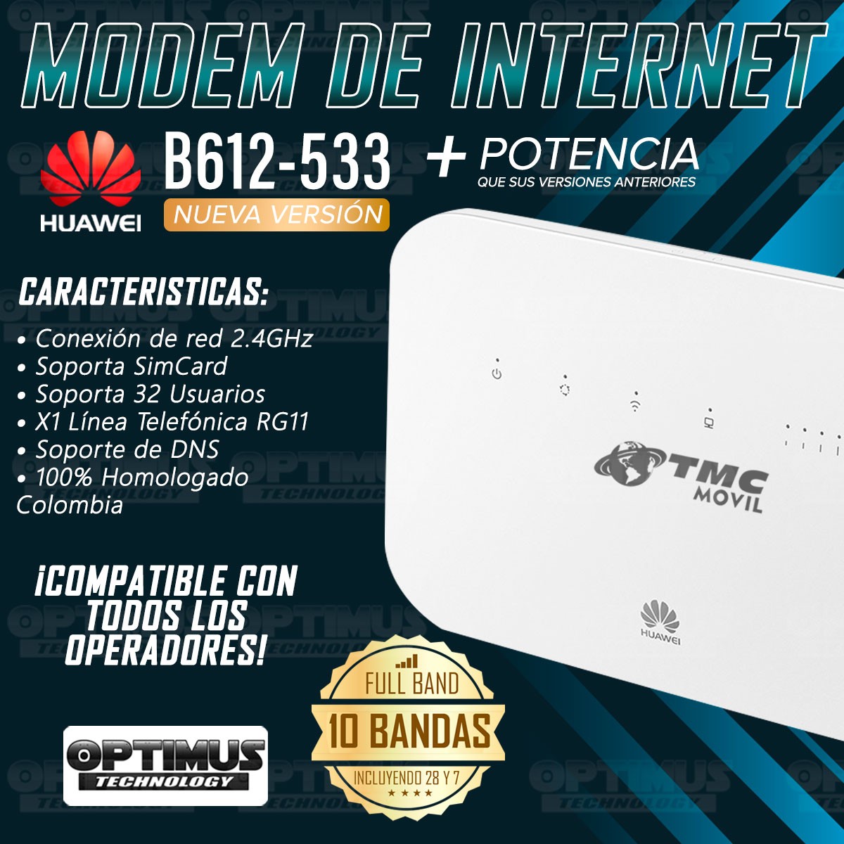 La compatibilidad del Enrutador Modem B612-533 en las diferentes redes 3G y 4G LTE con todos los operadores de Colombia y América Latina