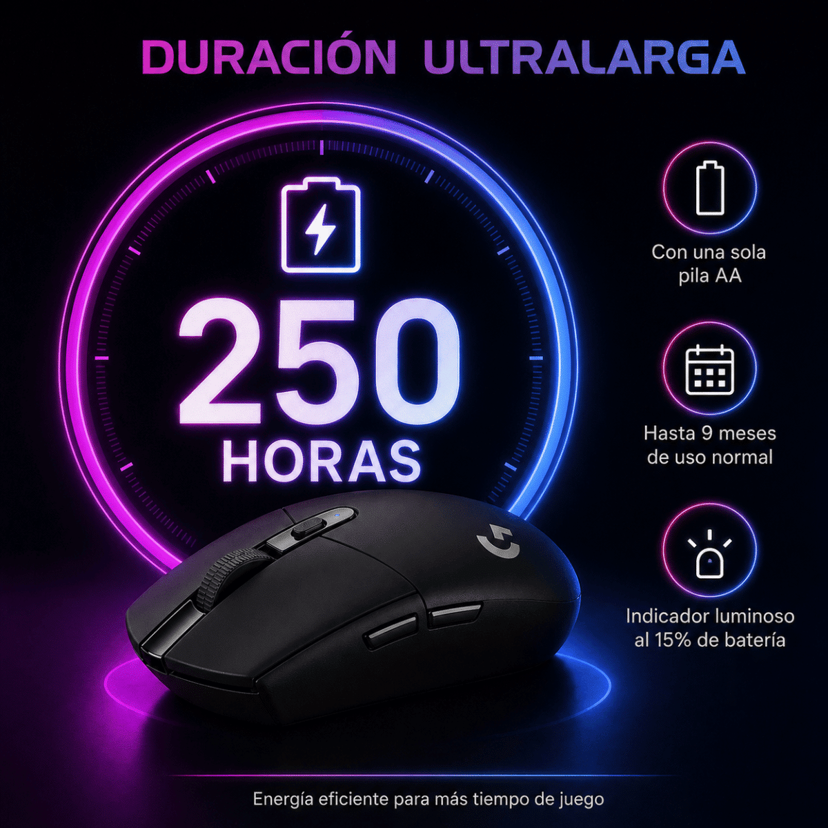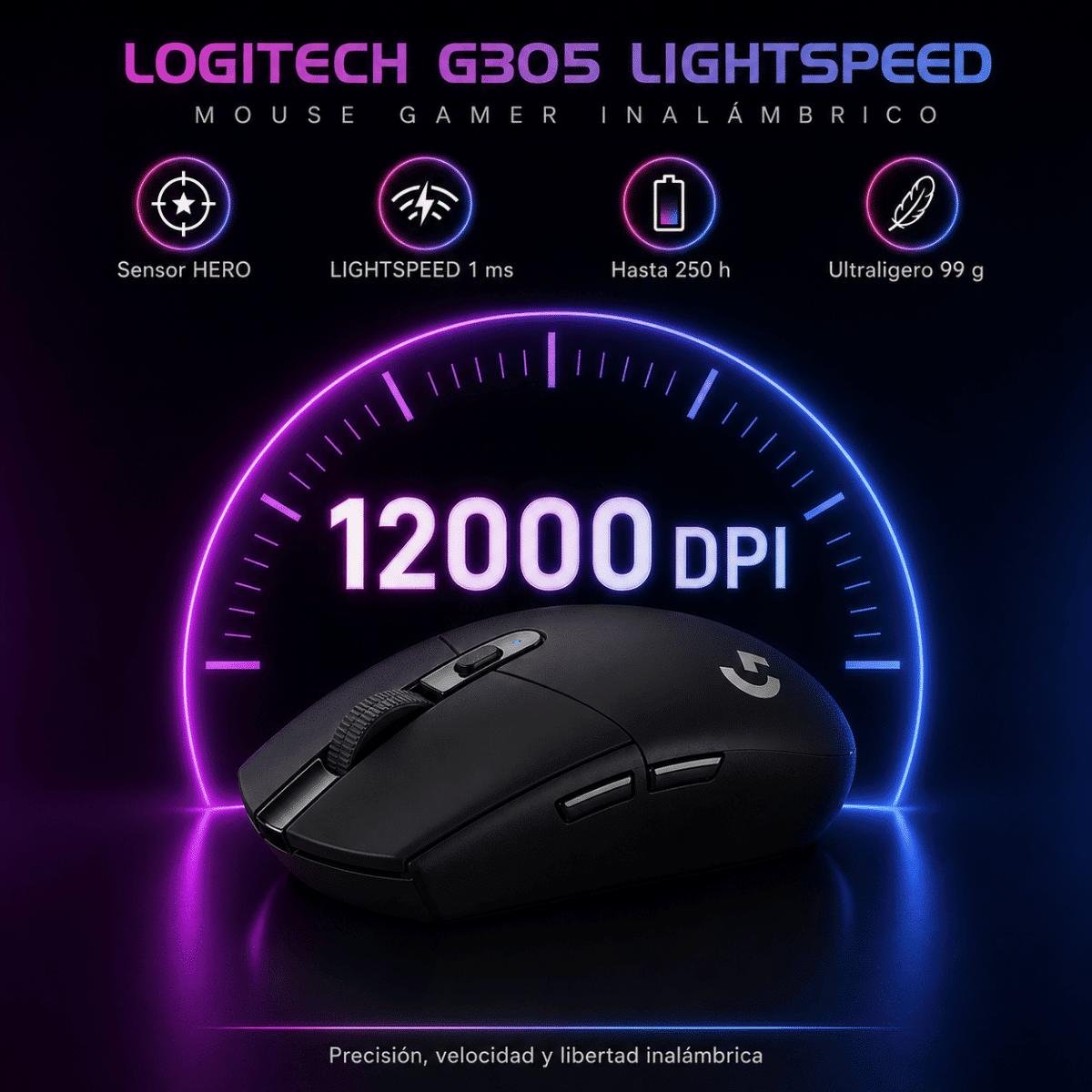Logitech G305 LIGHTSPEED ofrece rendimiento competitivo, precisión profesional y autonomía extendida en un mouse gamer inalámbrico compacto, ligero y potente.