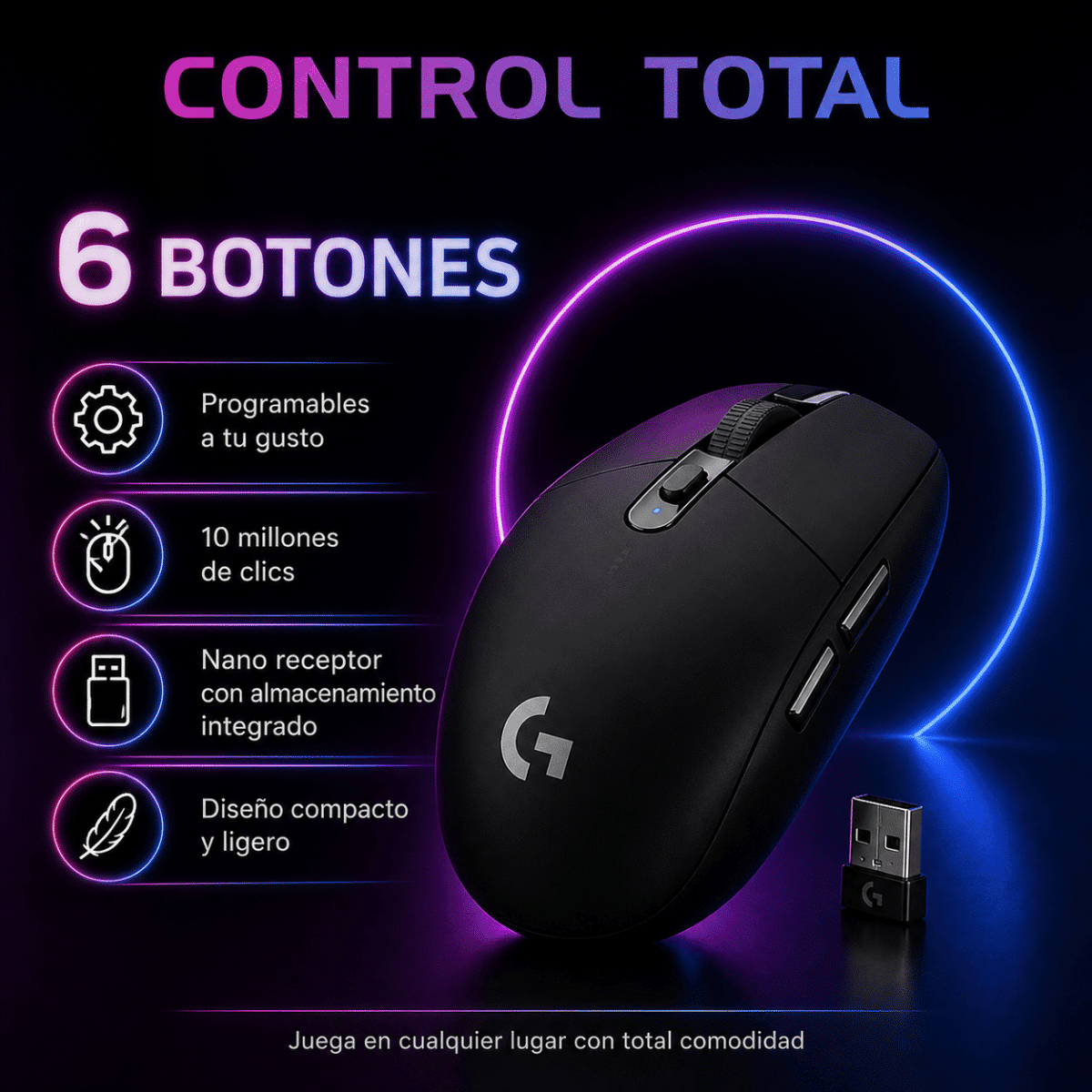 Incluye almacenamiento integrado para el nano receptor USB, convirtiéndolo en un excelente compañero para jugar en cualquier lugar.