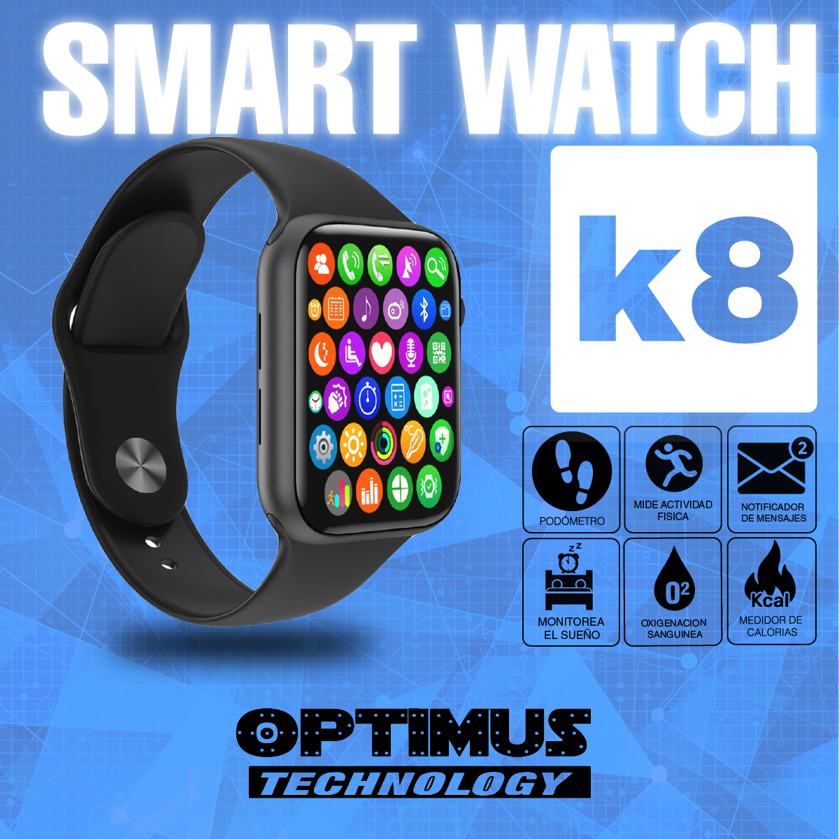 Los ¡Nuevos Relojes Inteligentes Smartwatch K8 de OPTIMUS™ tienen múltiples funciones que cuidan al máximo tu salud como frecuencia cardíaca, Oxigenación sanguínea, Modos deportivos y muchas funciones más!