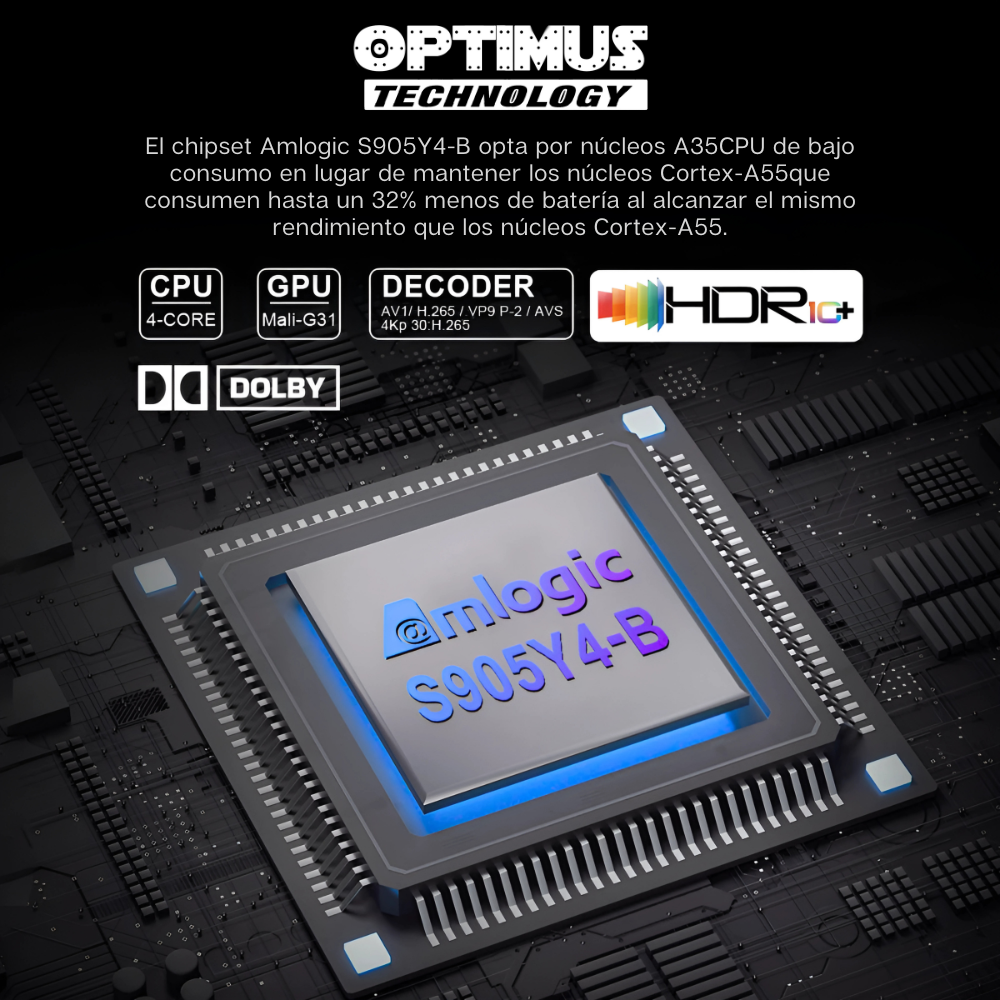 Este dispositivo cuenta con una alta velocidad de reacción gracias a su Quad Core Amlogic S905Y4-B, que proporciona una velocidad de funcionamiento ultrarrápida y capacidad de procesamiento gráfico profesional. Incluye compatibilidad con Dolby audio ATMOS, DTS y el codec AV1.
